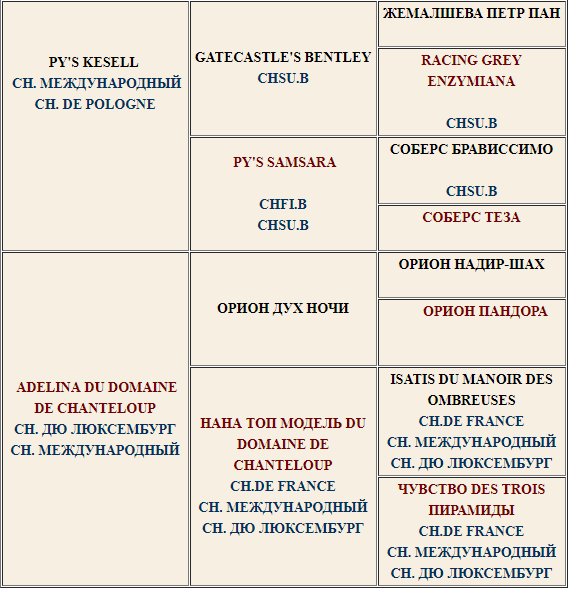 Подробную родословную (с именами, титулами, фотографиями предков), а также фотографии и родословные всех щенков , от данного кобеля, можно посмотреть тут
