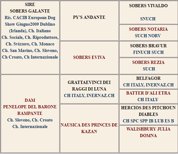 Подробную родословную (с именами, титулами, фотографиями предков), а также фотографии и родословные всех щенков , от данного кобеля, можно посмотреть тут
