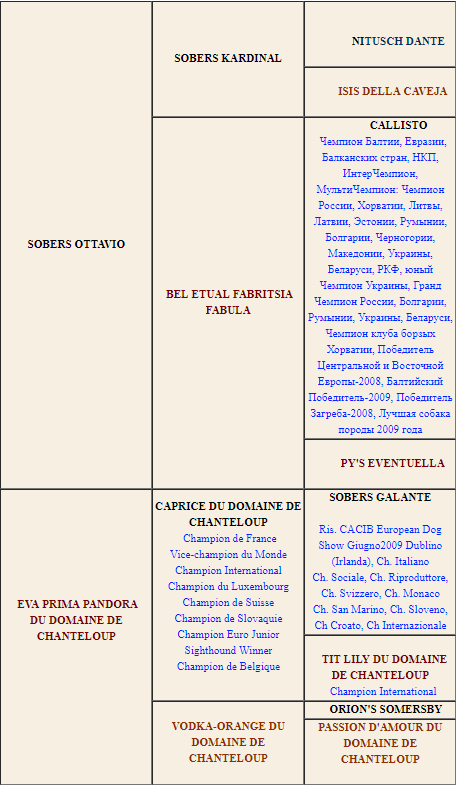 Подробную родословную (с именами, титулами, фотографиями предков), а также фотографии и родословные всех щенков, можно посмотреть тут