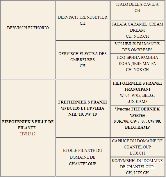 Подробную родословную (с именами, титулами, фотографиями предков), а также фотографии и родословные всех щенков , от данного кобеля, можно посмотреть тут