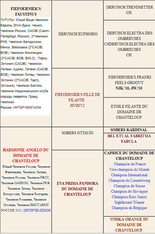 ТИТУЛЫ: Юный Вице-Чемпион Европы 2014 (Брно, Чехия), Чемпион России, CACIB (Санкт-Петербург, Россия), 3*Чемпион РКФ, Чемпион Белоруссии, Минск, Belorussia (2*CACIB, BOB), Чемпион Финляндии (3*CACIB, BOB, BIG-2), Пярну, Эстония (CACIB), Чемпион Латвии, Адажи, Латвия (CACIB, BOB), Чемпион Литвы, Чемпион Эстонии (2*CACIB, Тарту, Эстония), Санкт-Петербург (CACIB), Чемпион Балтии, Чемпион Украины, Чемпион Национального клуба породы левретка, Гранд Чемпион России, ИНТЕРЧЕМПИОН